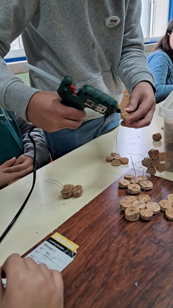 Nas disciplinas de EV, ET e no clube do Patrimonio, os alunos estão executar flores de amendoeira com rolhas de cortiça, recicladas, assim como um painel em pintura de tecido, sob o tema das amendoeiras em flor.